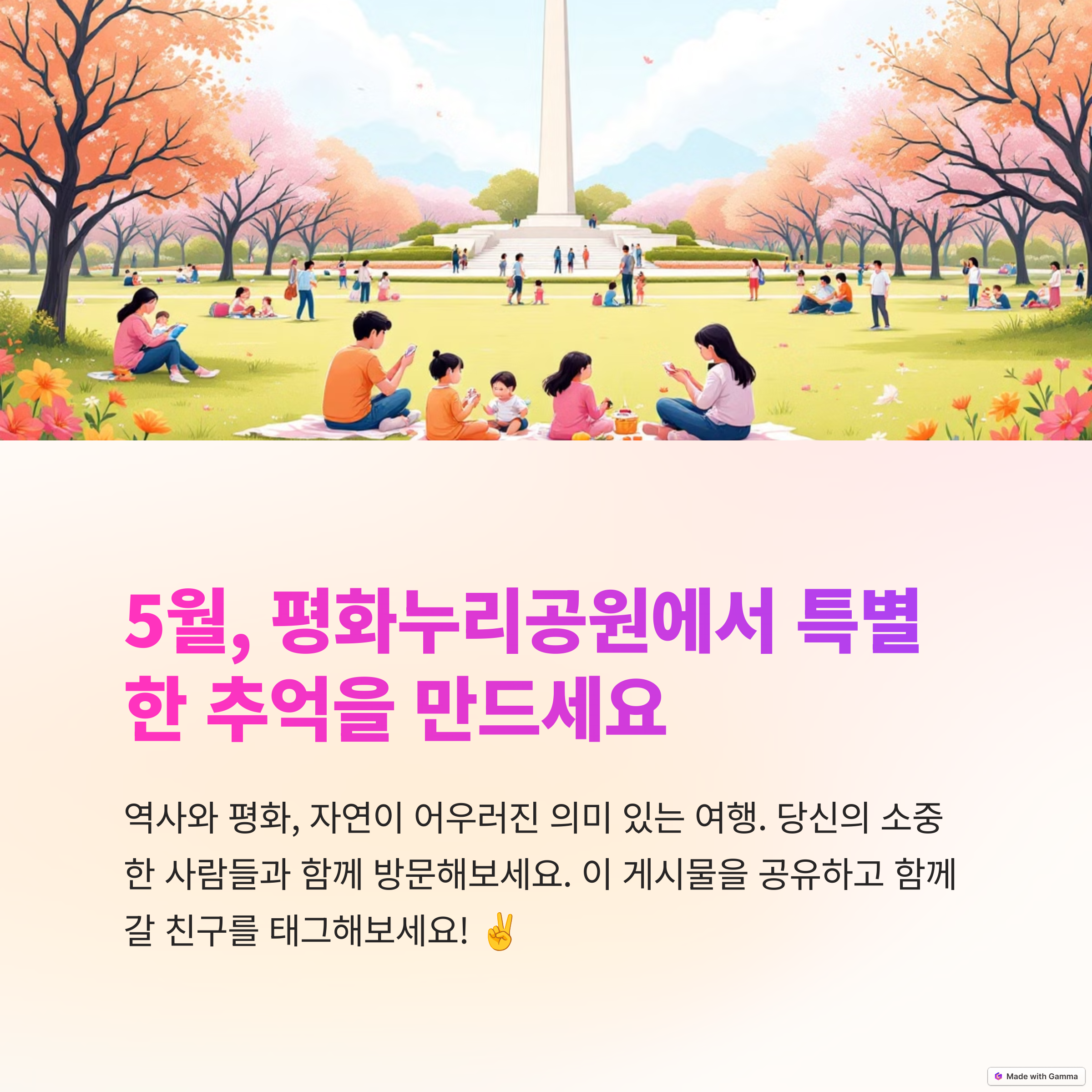이곳은 한국전쟁의 상처를 간직하면서도 평화와 화합의 메시지를 전하는 곳으로, 특히 따뜻한 봄날에는 관광객들의 발길이 끊이지 않습니다.