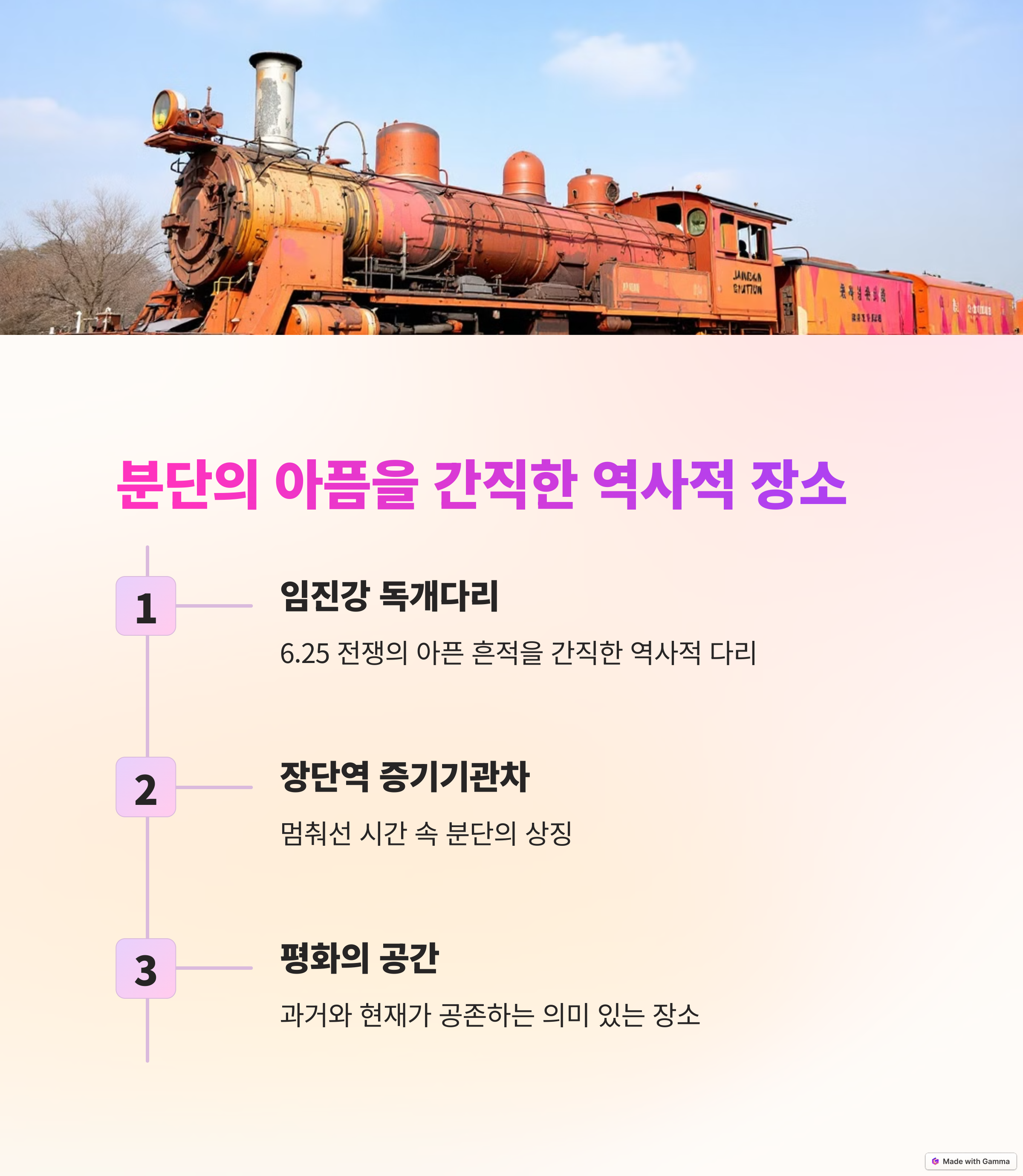 임진강 독개다리는 남북 분단의 아픔을 고스란히 간직한 곳이며, 경의선 장단역 증기기관차는 전쟁 당시의 흔적을 보여주는 중요한 유물입니다.