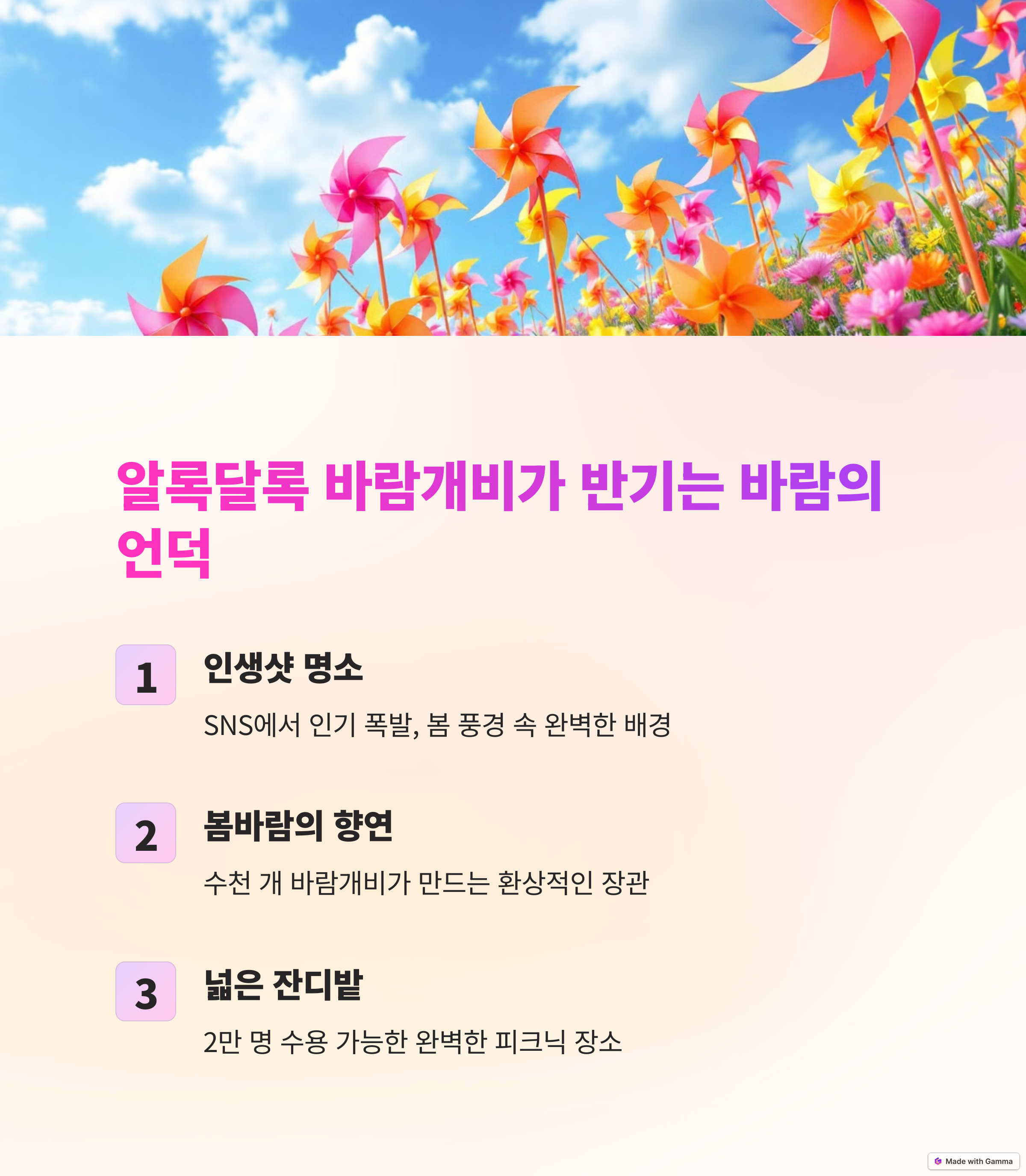 한국전쟁의 아픔을 간직한 이곳은, 평화와 공존의 가치를 되새길 수 있는 특별한 장소인데요. 5월의 따뜻한 봄바람을 맞으며 알록달록한 바람개비가 가득한 '바람의 언덕'을 거닐어 보는 것만으로도 힐링이 되는 곳이랍니다.