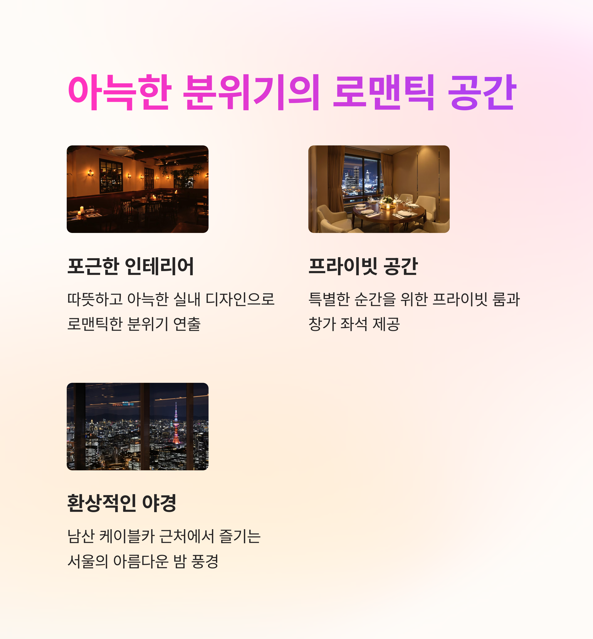 서울의 아름다운 야경을 감상하며, 정성 가득한 코스 요리를 즐길 수 있는 곳으로 많은 사랑을 받고 있습니다.