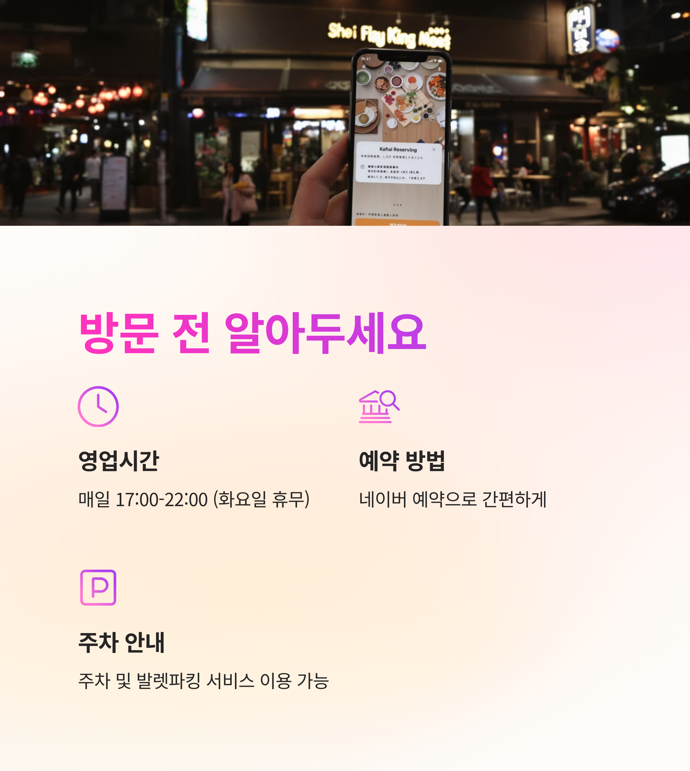 예약은 네이버를 통해 가능하며, 주차 및 발렛파킹 서비스도 제공되어 차량을 이용하는 고객들도 편리하게 방문할 수 있습니다.