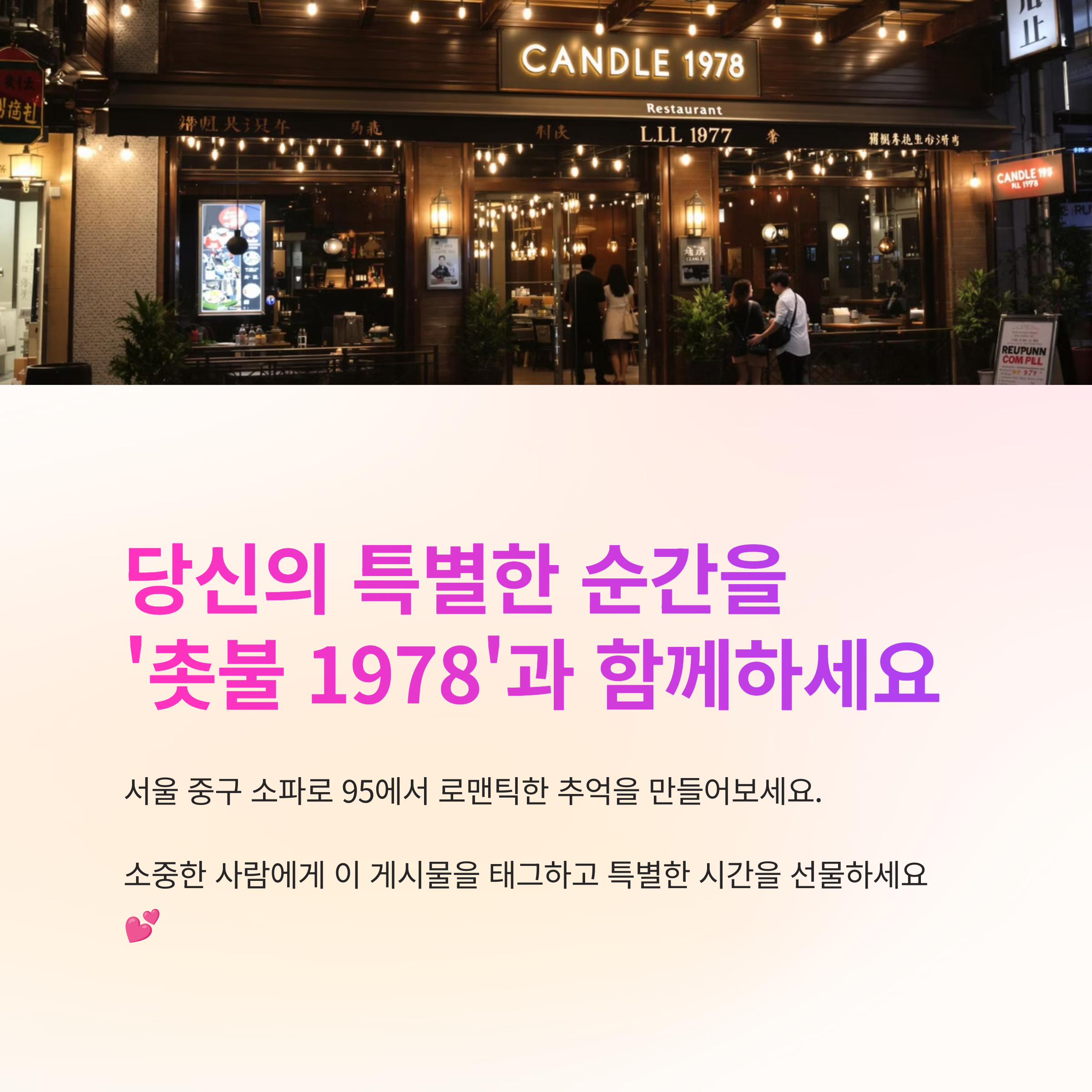 촛불 1978은 로맨틱한 분위기를 자랑하는 레스토랑으로, 아늑한 조명과 세련된 인테리어가 특징입니다.