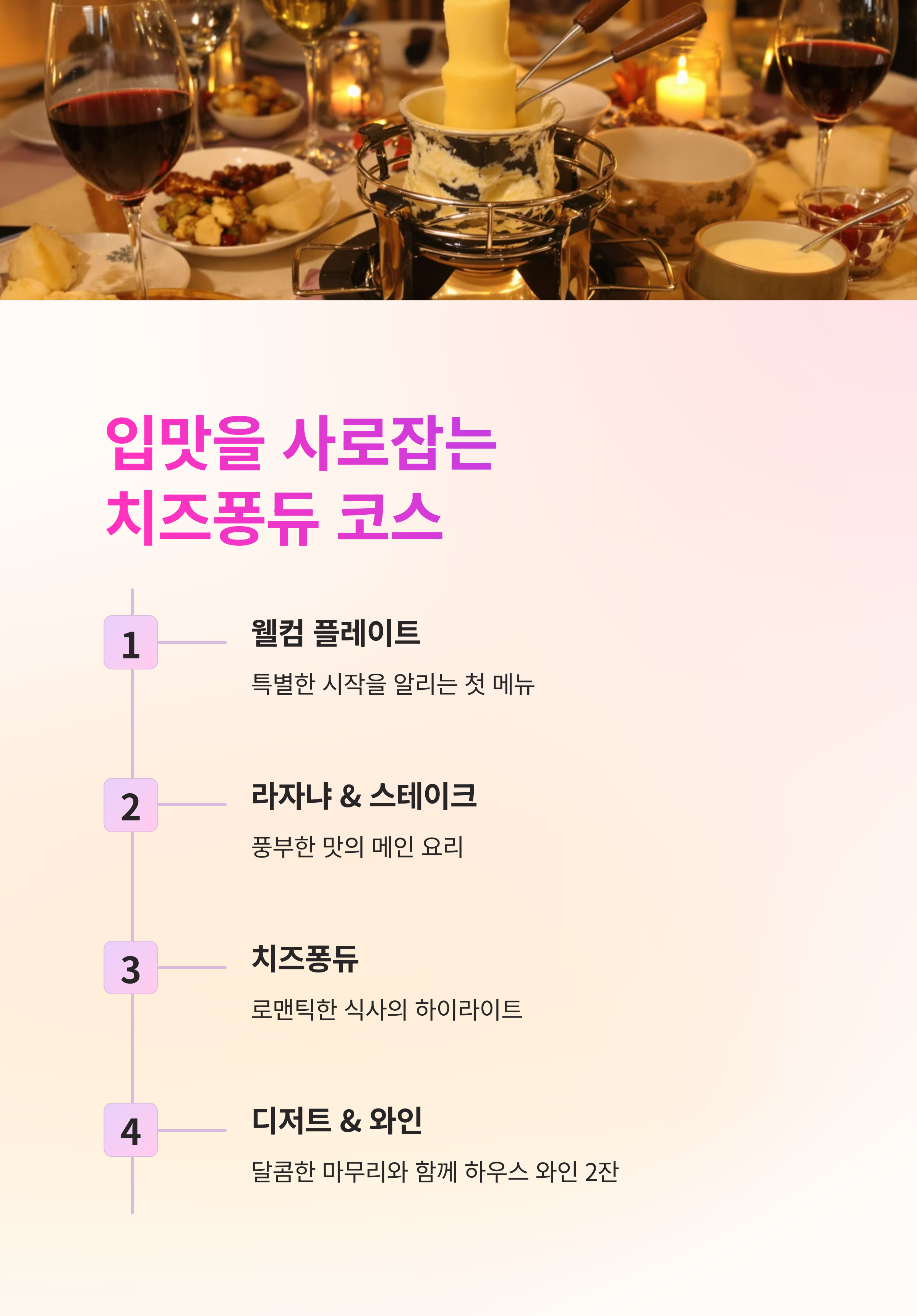 | 대표 메뉴 | 치즈퐁듀 코스요리 + 하우스 와인 |