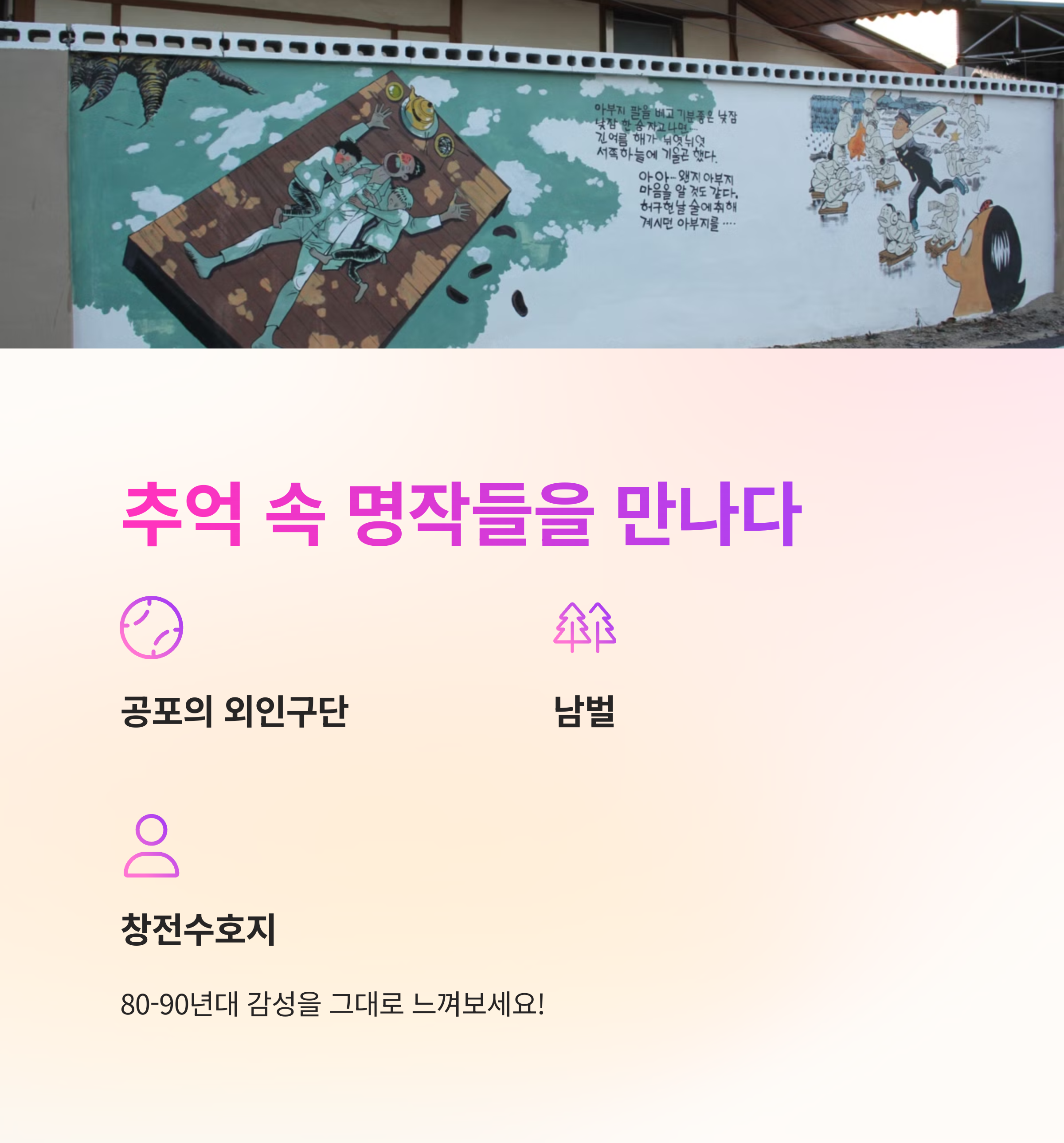 | 주요 볼거리 | 950m 벽화 거리, 남벌열차카페, 만화도서관 |