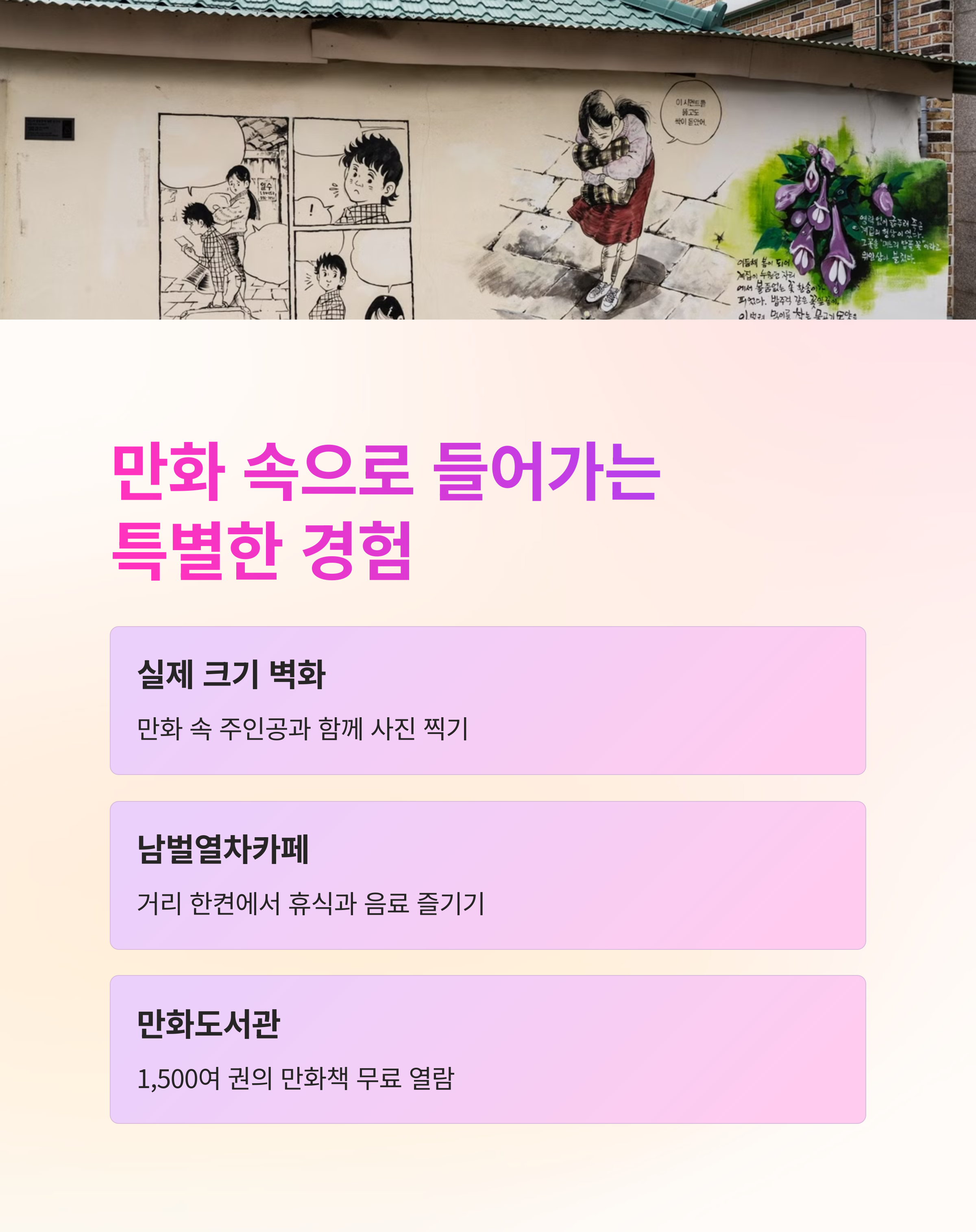 주요 볼거리 950m 벽화 거리, 남벌열차카페, 만화도서관