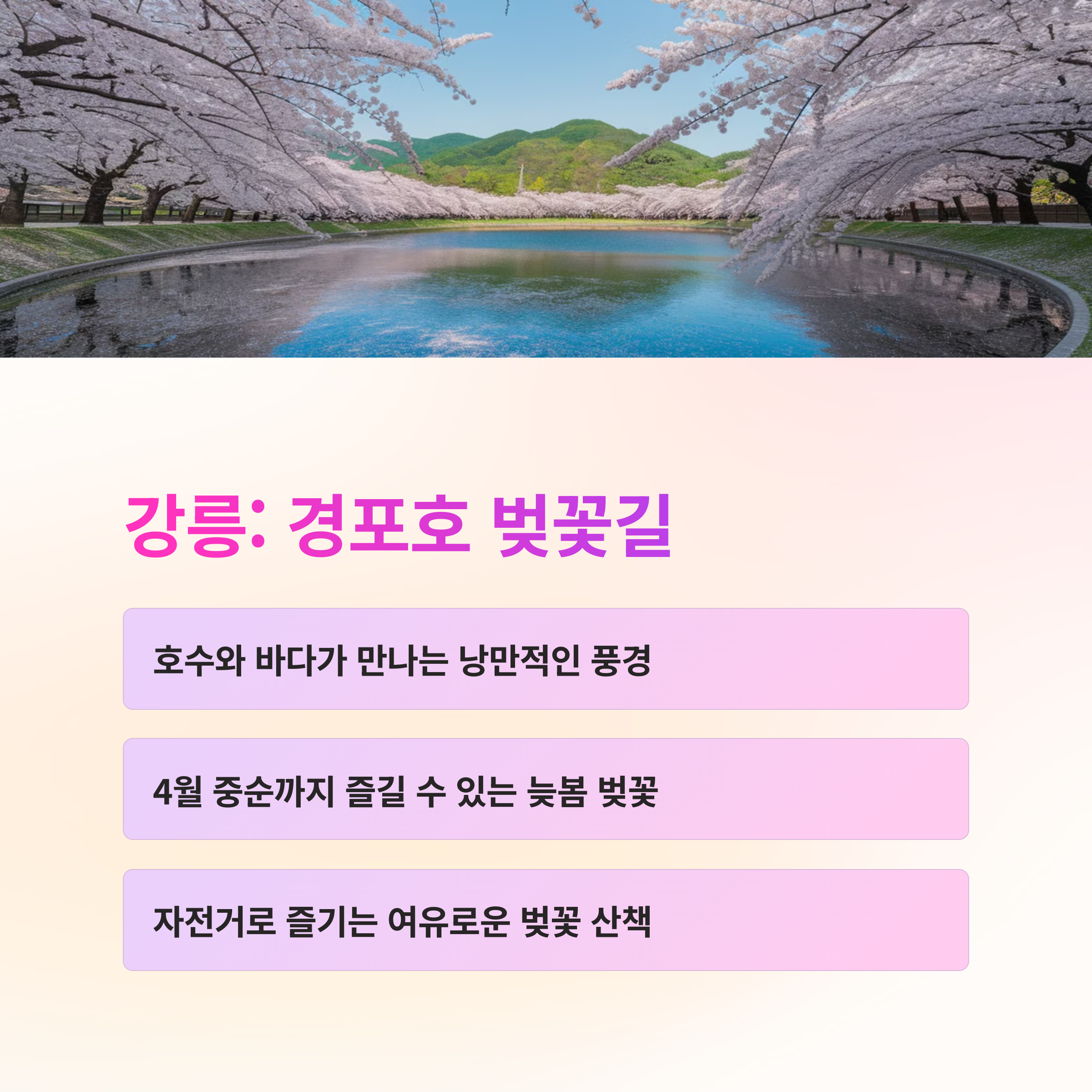 강릉 경포호 벚꽃길은 호수와 바다가 어우러진 낭만적인 장소로, 벚꽃이 바람에 흩날리는 모습을 감상하기에 안성맞춤입니다.