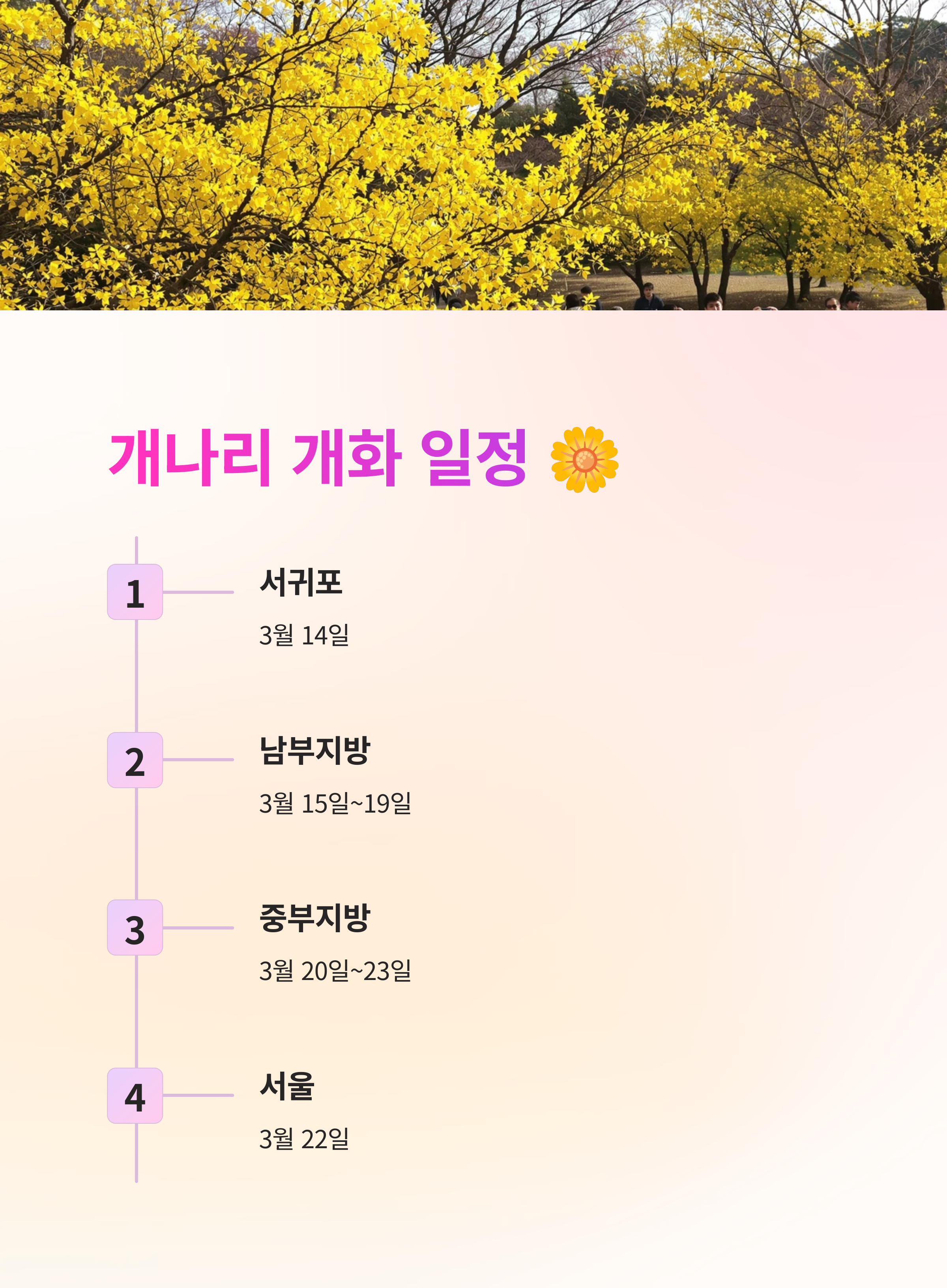 올해 봄 여행을 계획하고 계시다면 개화 예측 정보를 참고하여 일정에 맞게 여행지를 선정해 보세요.