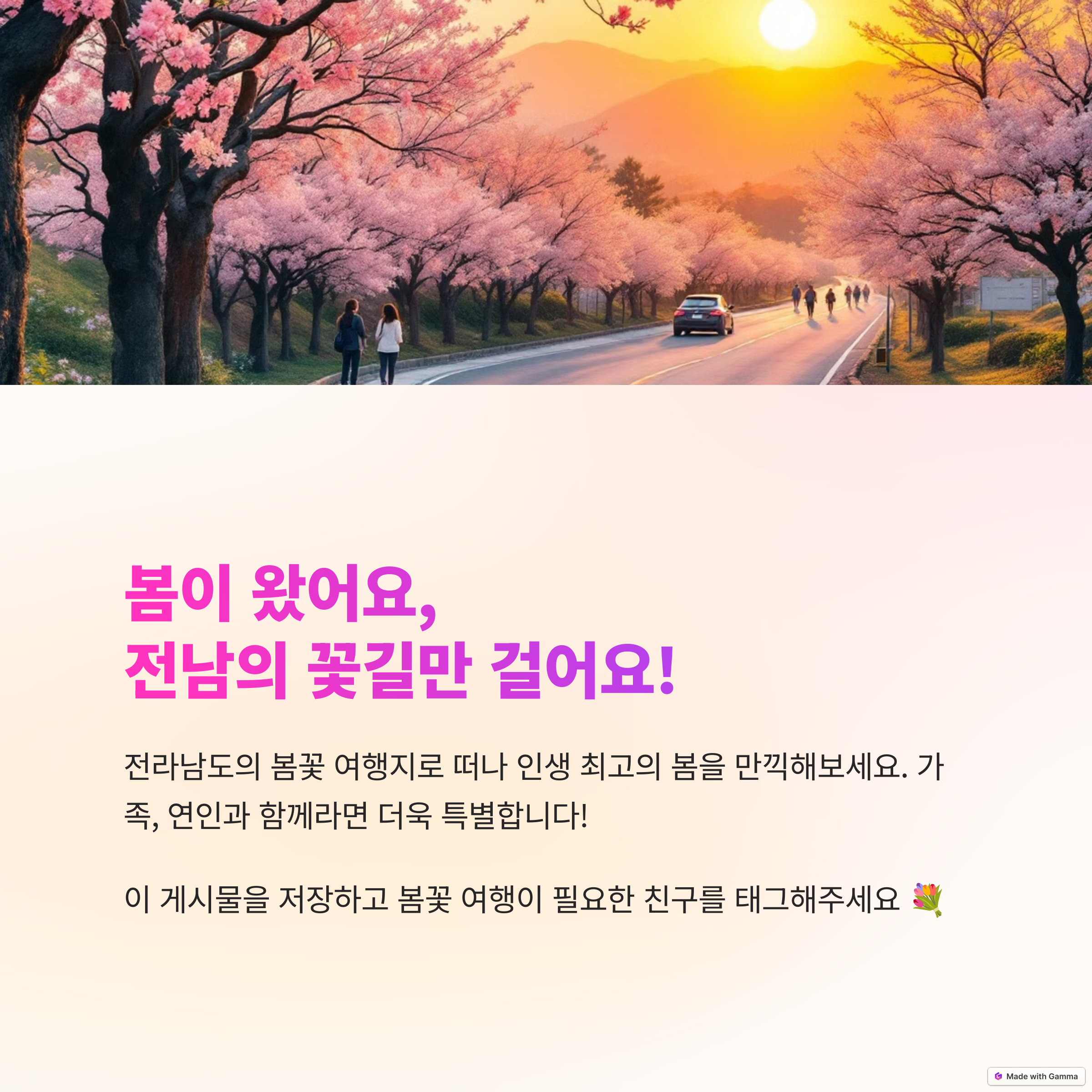 따뜻한 봄바람과 함께 아름다운 꽃들의 향연을 만끽하며 잊지 못할 추억을 만들어보세요.