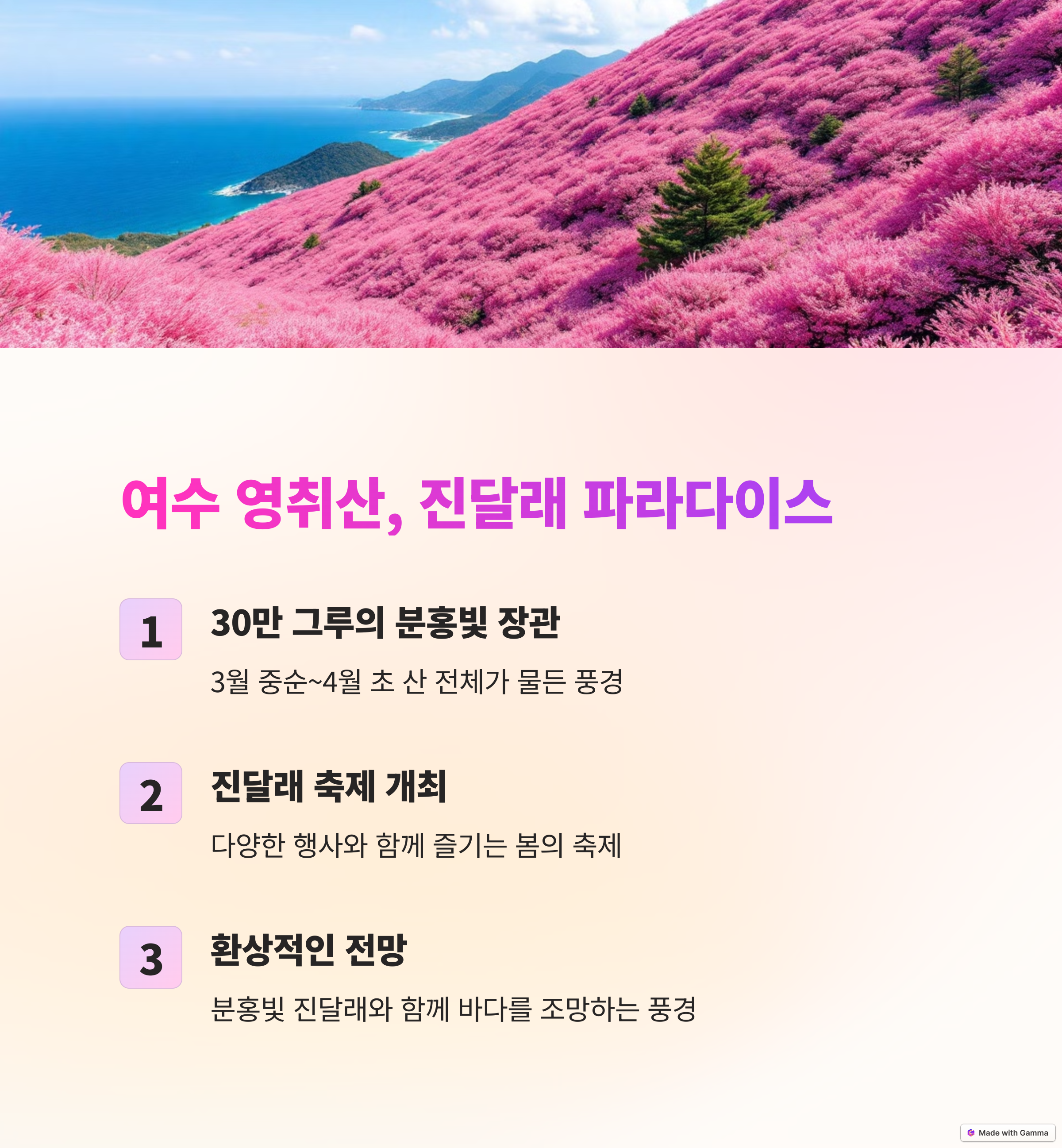 3월 중순부터 4월 초까지 여수 영취산에서는 약 30만 그루의 진달래가 산을 붉게 물들이며 장관을 이룹니다.