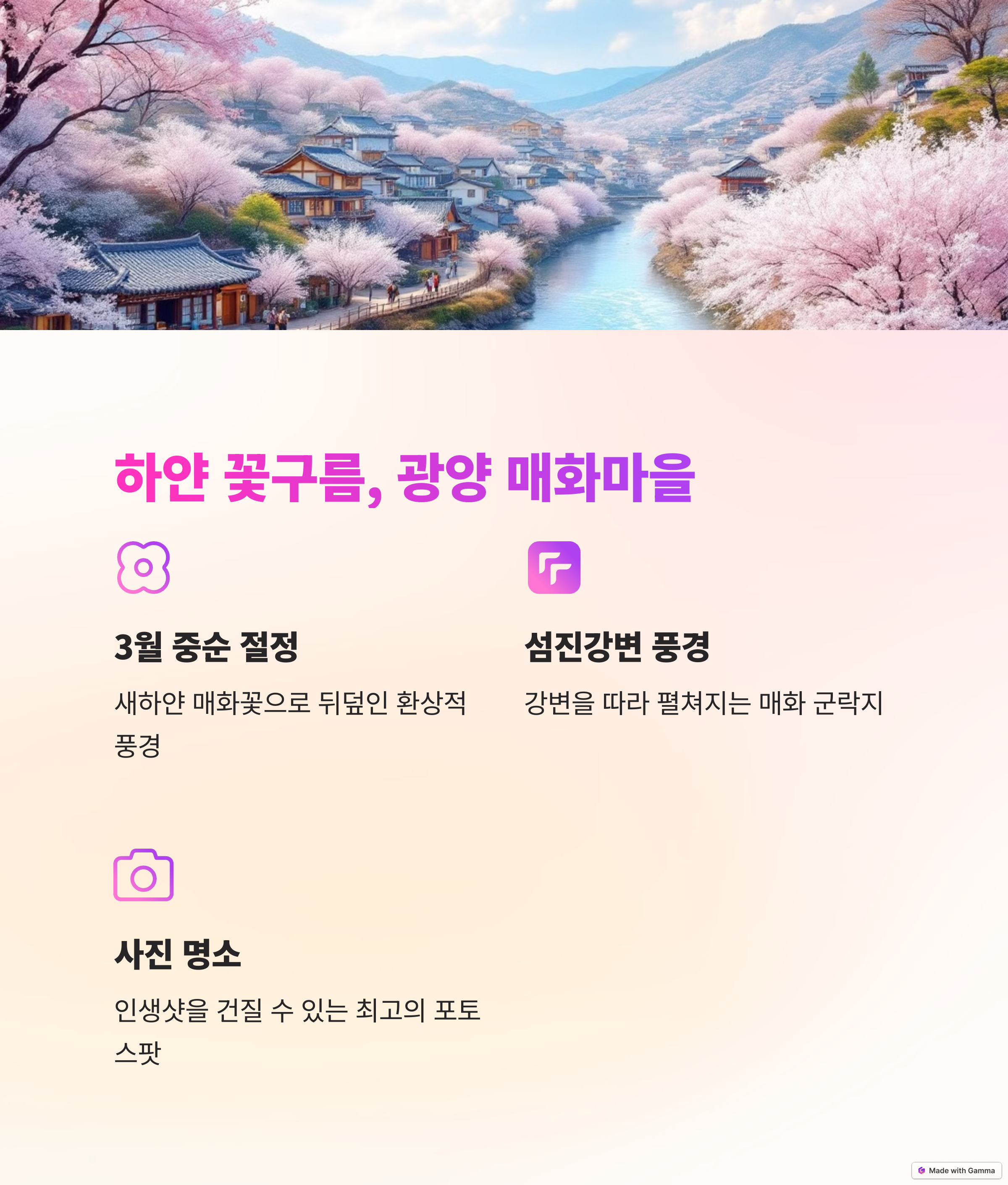 광양 매화마을은 3월 중순이 되면 하얀 매화꽃이 마을 전체를 뒤덮어 마치 설경을 연상케 합니다.