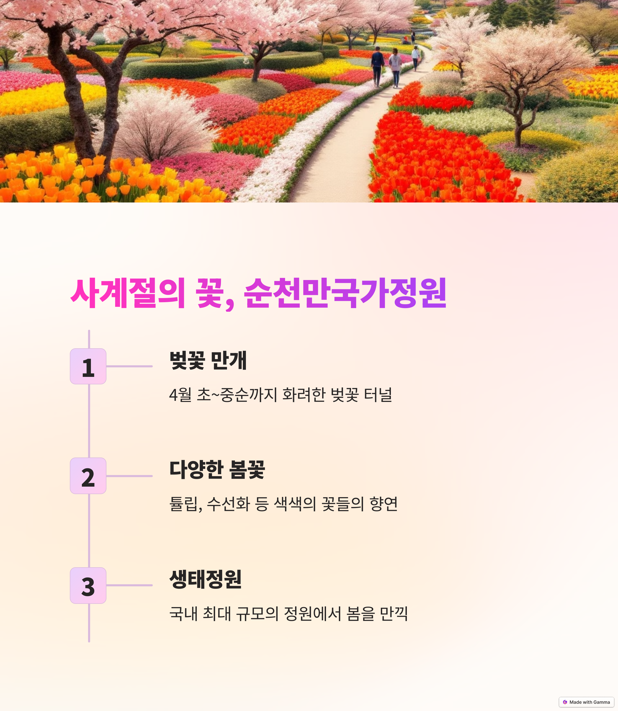 여수 영취산의 진달래, 광양 매화마을의 매화, 순천만국가정원의 벚꽃까지, 각 지역별로 색다른 봄꽃 여행의 매력을 느낄 수 있습니다.
