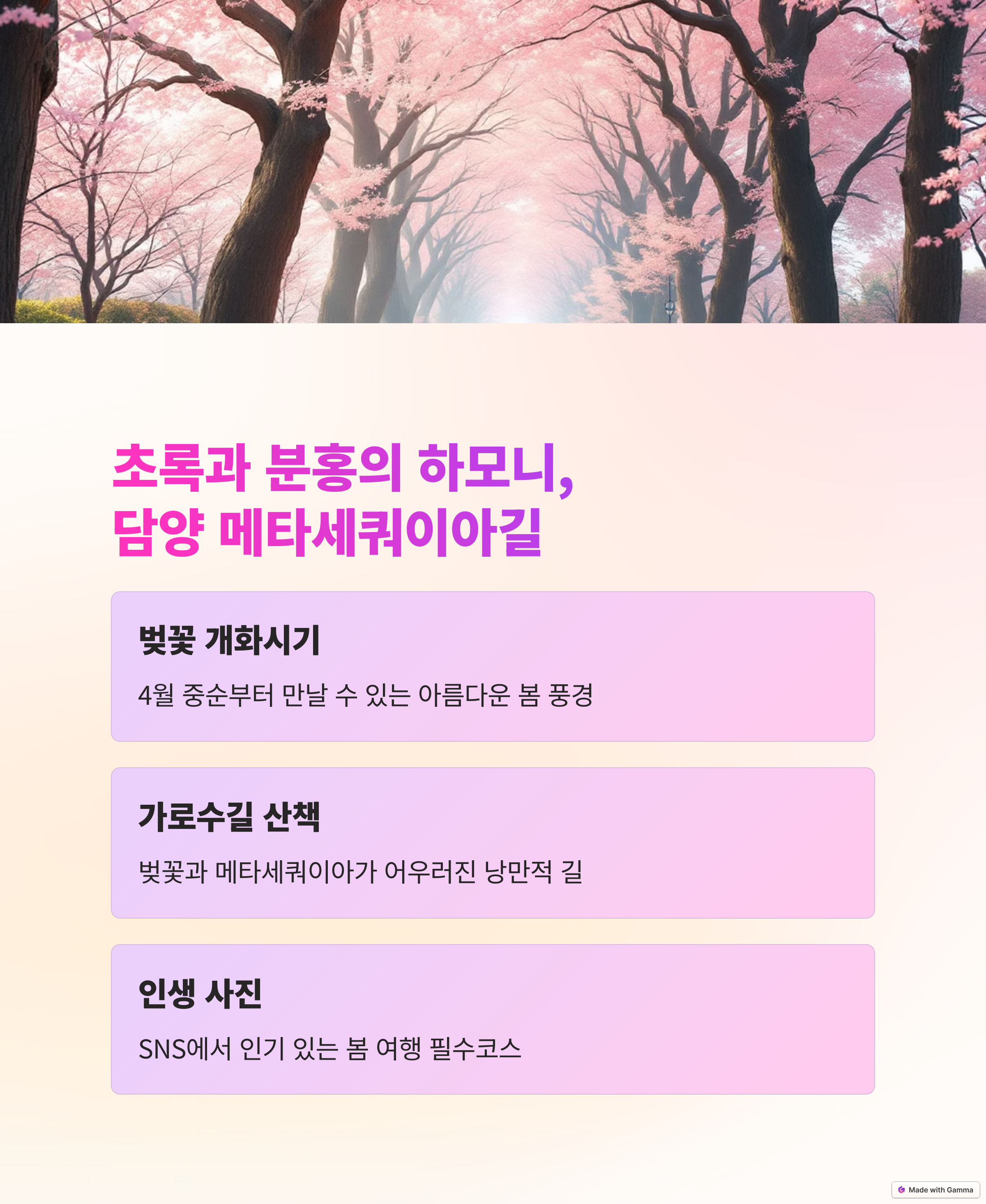 담양 메타세쿼이아길은 4월 중순부터 벚꽃이 피기 시작하며, 길게 뻗은 나무들과 조화를 이루는 풍경이 매우 아름답습니다.