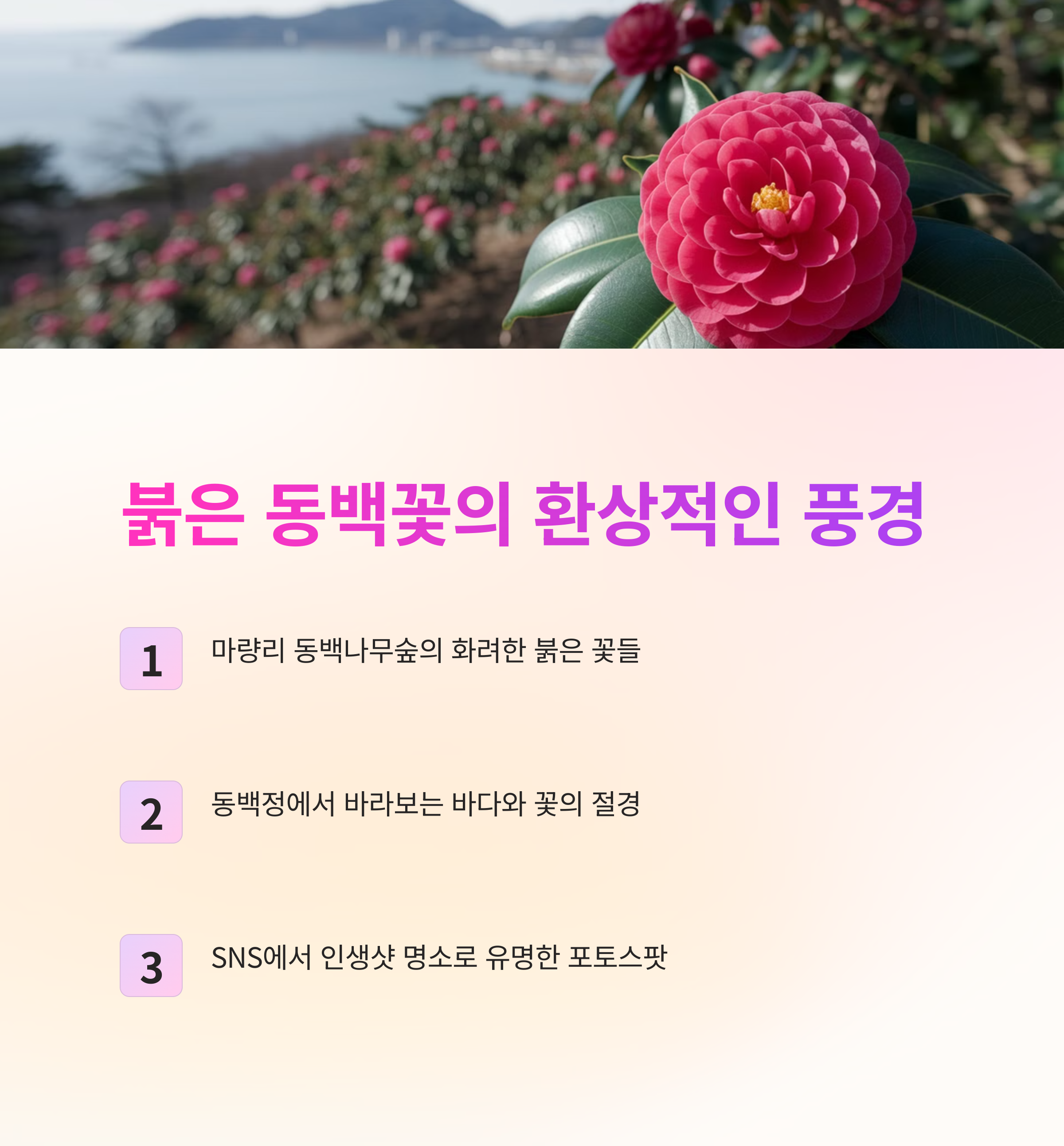 붉게 물든 동백꽃이 만들어내는 환상적인 풍경 속에서 인생샷을 남길 수 있으며, 축제 기간 동안 신선한 주꾸미를 현장에서 구매하거나 택배로 주문할 수도 있습니다.