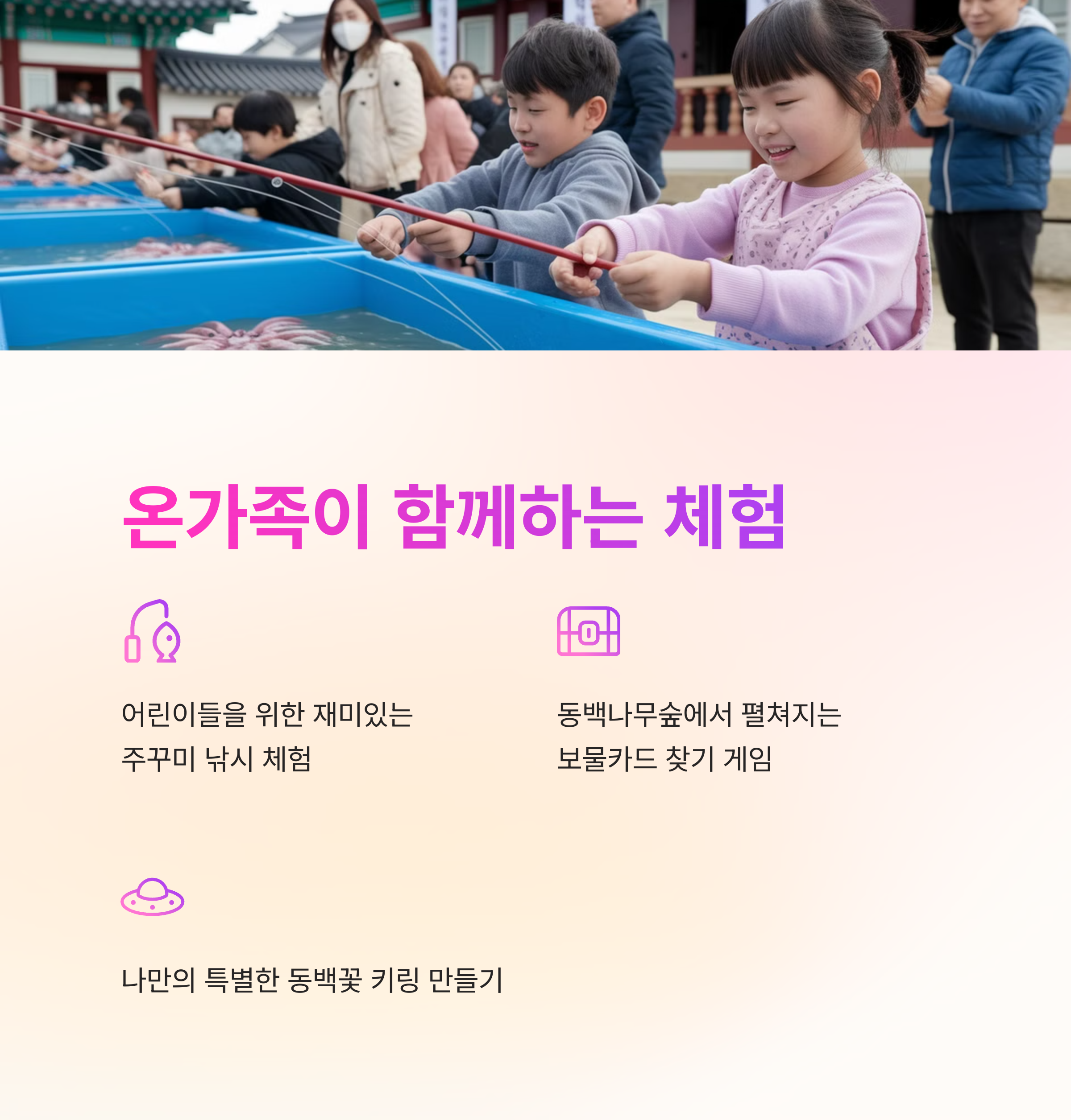 어린이 주꾸미 낚시 체험을 통해 직접 잡은 주꾸미를 요리해 볼 수 있으며, 동백나무숲 보물카드 찾기와 동백꽃 키링 만들기 등 다양한 이벤트가 준비되어 있어 더욱 즐거운 시간이 될 것입니다.